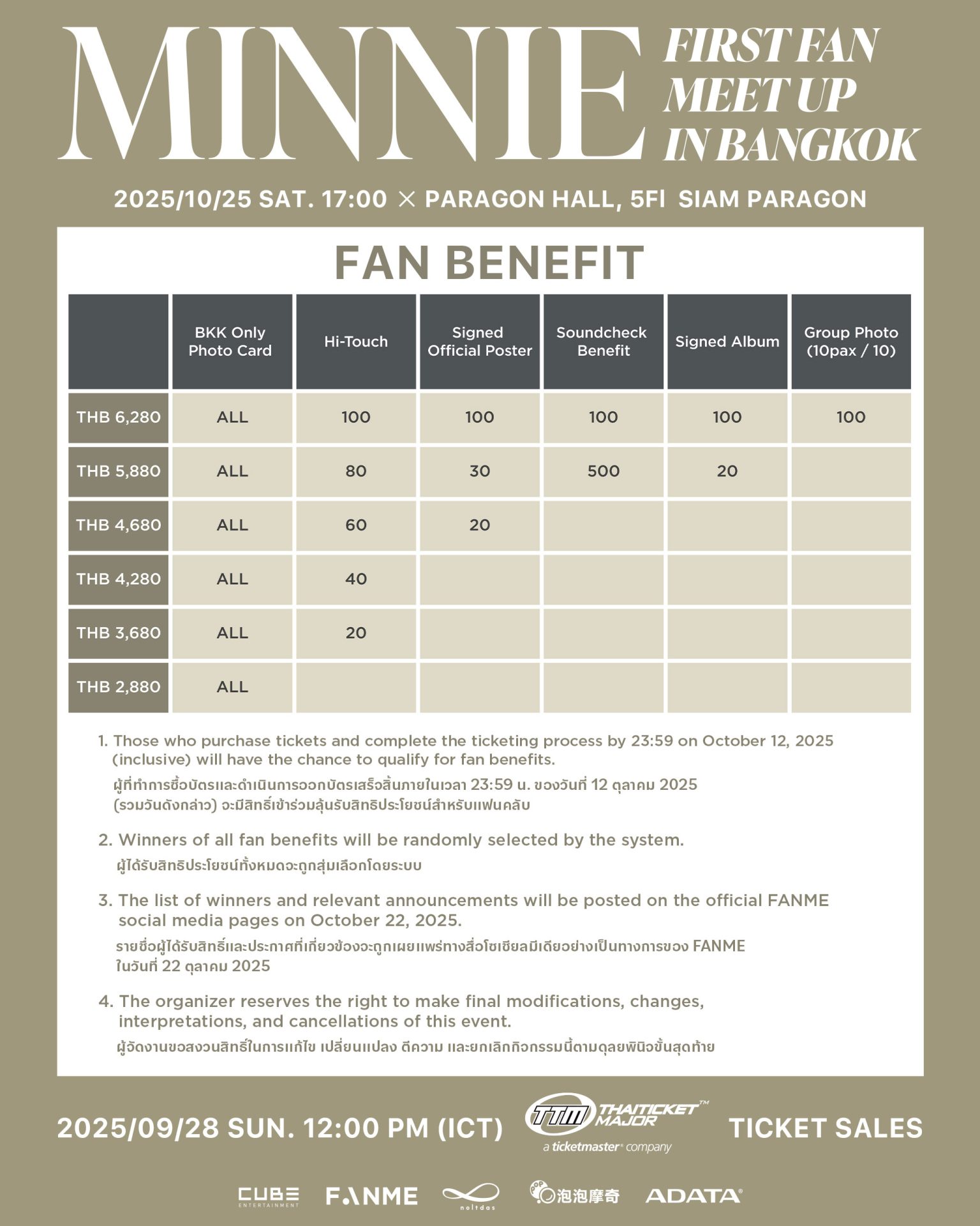 งานนี้เปิดจำหน่ายบัตรวันอาทิตย์ที่ 28 กันยายน 2568 เวลา 12.00 น. เป็นต้นไป ทาง www.thaiticketmajor.com ราคาบัตร 6,280 / 5,880 / 4,680 / 4,280 / 3,680 และ 2,880 บาท ลุ้นรับเบเนฟิต อาทิ Thailand Exclusive Photo Card , Hi-Touch , Signed Poster , Soundcheck , Signed Album และ Group Photo สามารถติดตามรายละเอียดเพิ่มเติมได้ที่ IG: fanme.official / FB:FANME และ X:@official_fanme