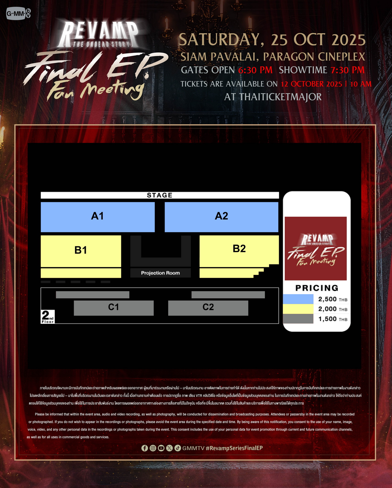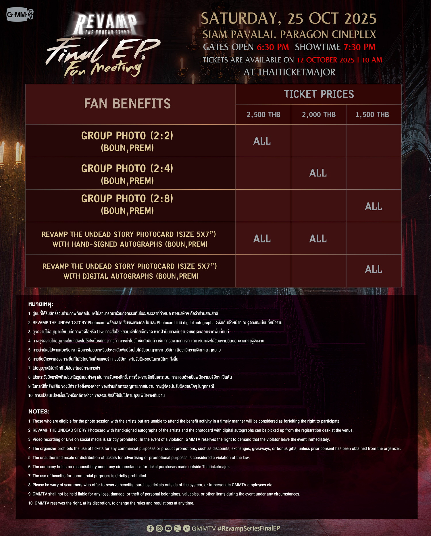 สำหรับผู้ที่สนใจสามารถจองบัตรเข้าร่วมงาน “REVAMP Final EP. FANMEETING” เปิดจำหน่ายบัตร วันอาทิตย์ที่ 12 ตุลาคมนี้ เริ่มเวลา 10.00 น. เป็นต้นไป บัตรราคา 2,500 / 2,000 / 1,500 บาท ที่ไทยทิคเก็ตเมเจอร์ทุกสาขา,www.thaiticketmajor.com และ Call center โทร 0-2262-3456 หรือติดตามรายละเอียดเพิ่มเติมได้ที่ www.thaiticketmajor.com และ Facebook / Instagram / X / TikTok / YouTube / Weibo: GMMTV
