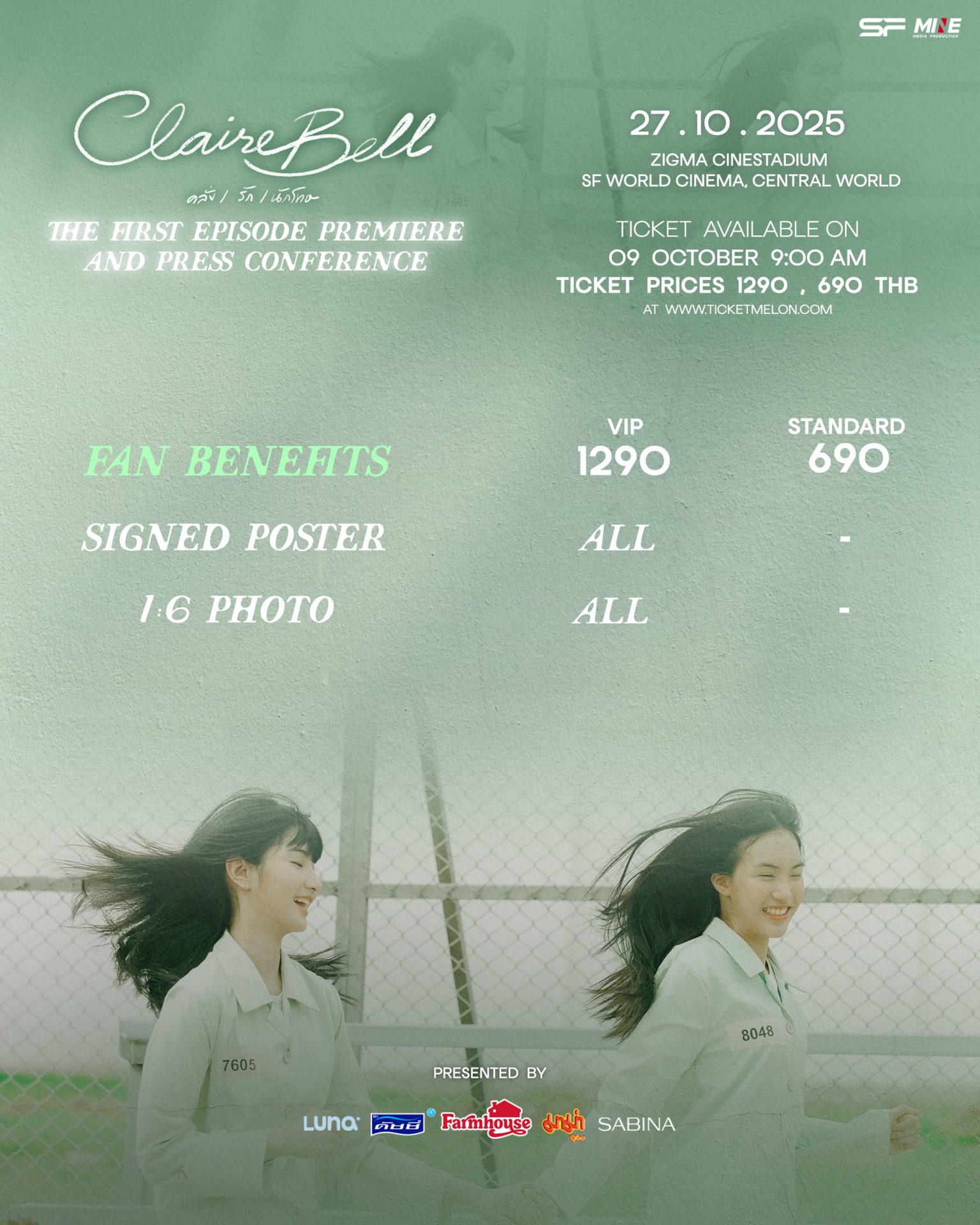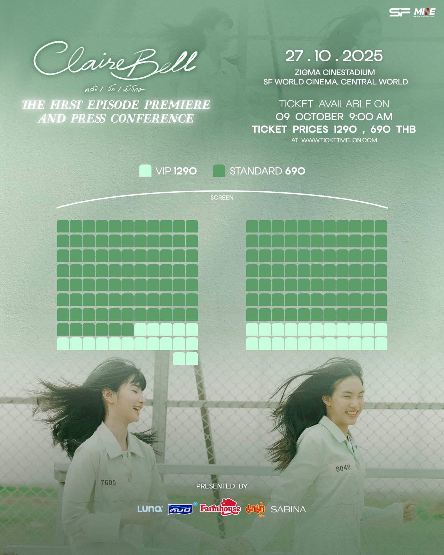 สำหรับผู้สนใจสามารถจับจองบัตรร่วมงาน “CLAIREBELL คลั่ง/รัก/นักโทษ THE FIRST EPISODE PREMIERE AND PRESS CONFERENCE“ ได้ในวันพฤหัสบดีที่ 9 ตุลาคมนี้ เวลา 9.00 น. ทาง www.ticketmelon.com บัตรราคา 690 บาท และVIP 1,290 บาท ติดต่อสอบถามรายละเอียดเพิ่มเติมได้ที่ Facebook/Instagram/X/Youtube : Mine Media Production