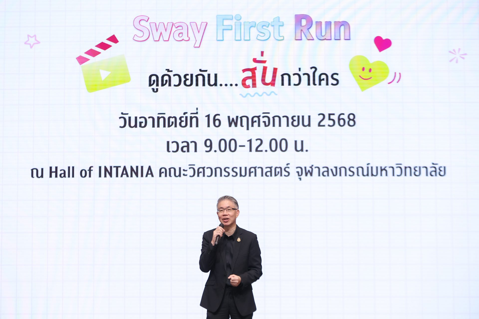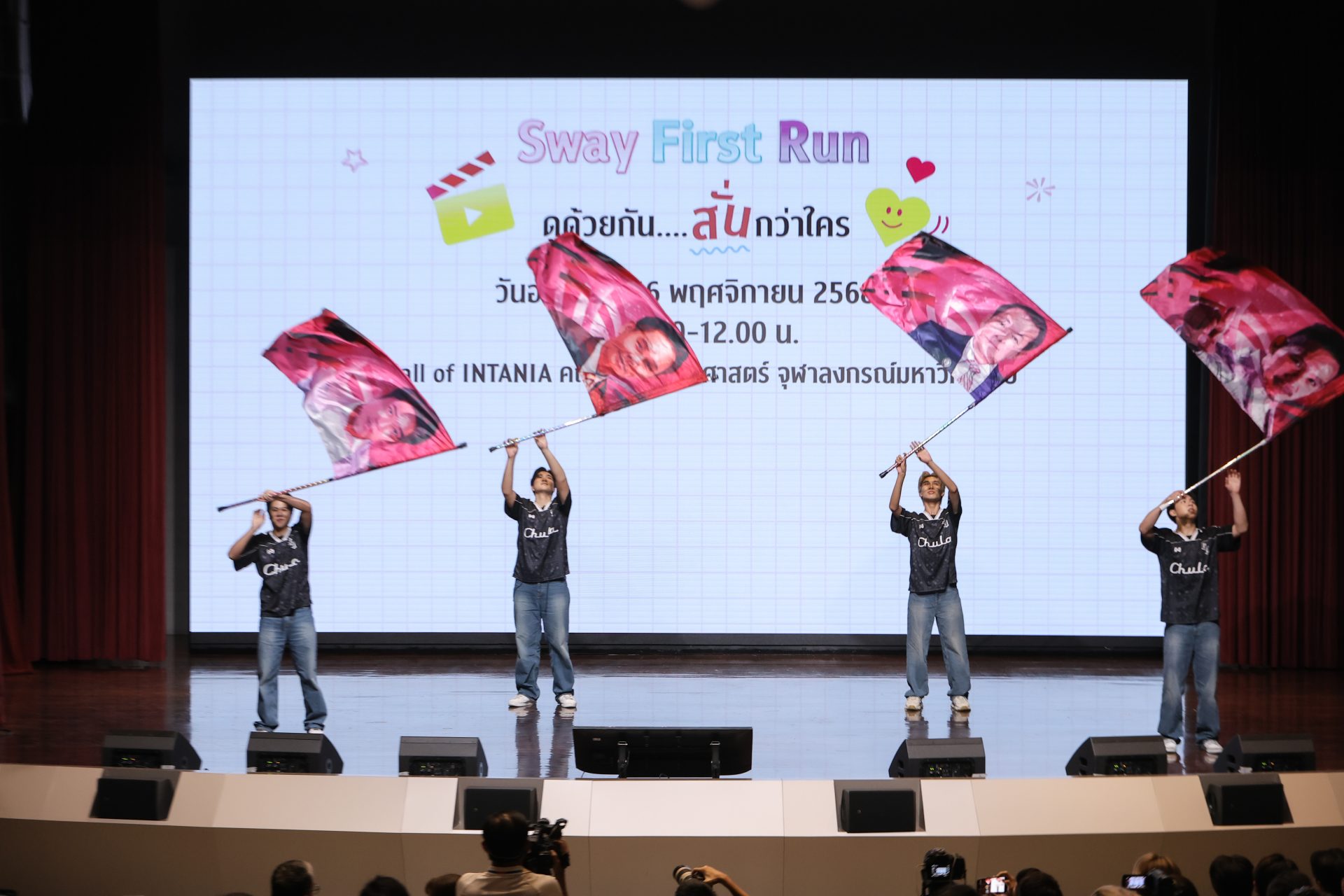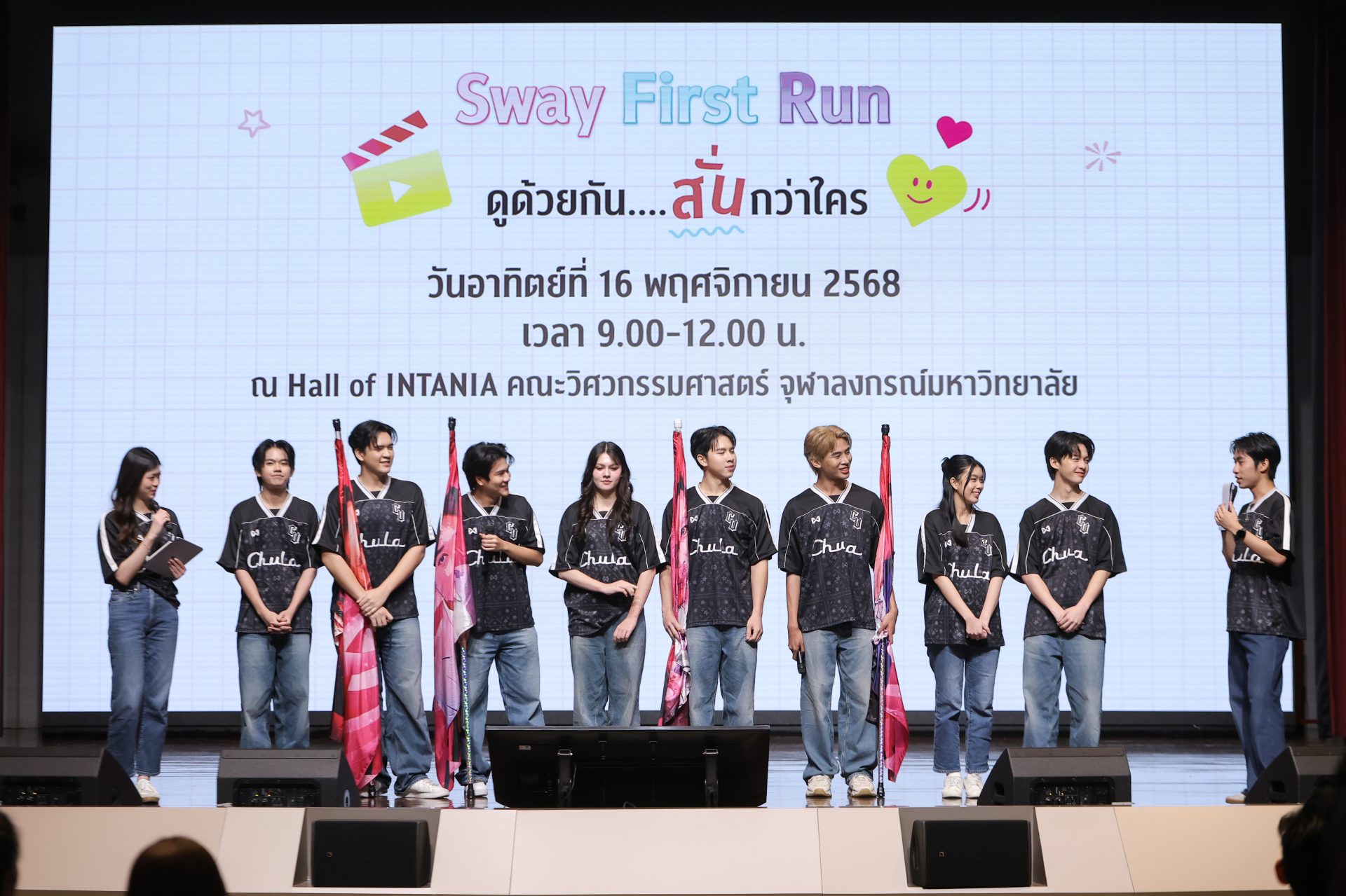 สมาคมนิสิตเก่าจุฬาลงกรณ์มหาวิทยาลัยในพระบรมราชูปถัมภ์ (สนจ.) โดย ดร.ณัฐพล รังสิตพล นายกสมาคม เปิด Hall of INTANIA คณะวิศวกรรมศาสตร์ จุฬาลงกรณ์มหาวิทยาลัย จัดงาน “SWAY FIRST RUN ดูด้วยกัน สั่นกว่าใคร” ให้แฟน ๆ กว่า 400 คน ได้ชมซีรีส์แนวใหม่ “SWAY THE SERIES เพราะเธอใช่ไหม…ที่ทำให้ใจฉันสั่น” EP. แรกด้วยกัน โดยเหล่านักแสดงหน้าใหม่ยังได้เสิร์ฟโชว์สุดพิเศษทั้งการแสดงธง Chula Colorguard ใน “เพลงขวัญใจจุฬา” เวอร์ชั่นใหม่ เปิดตัวเพลงประกอบซีรีส์ “เธออีกแล้ว” โดย เคที่ แม็คเอ็นที พร้อมชวนเป็นส่วนหนึ่งของกิจกรรมปิยมหาราชานุสรณ์ ๒๕๖๘ : จุฬาลงกรณ์ แรงบันดาลใจของแผ่นดิน ร่วมบริจาคสมทบทุนจุฬาสงเคราะห์และทุนอาหารกลางวันและสนับสนุนกิจกรรมเพื่อสังคมของ สนจ. ต่อไป