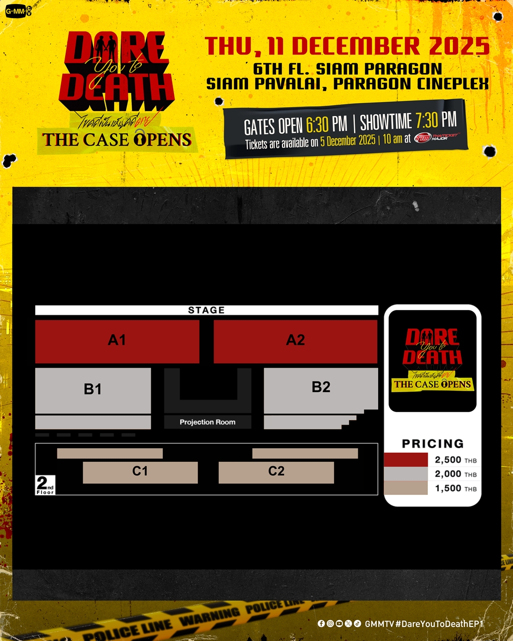 สำหรับผู้ที่สนใจสามารถจองบัตรเข้าร่วมงาน “Dare You to Death : The Case Opens” เปิดจำหน่ายบัตร ในวันศุกร์ที่ 5 ธันวาคม 2568 เวลา 10.00 น. เป็นต้นไป บัตรราคา 2,500 / 2,000 / 1,500 บาท ที่ ไทยทิคเก็ตเมเจอร์ทุกสาขา, www.thaiticketmajor.com และ Call Center โทร 0-2262-3456 หรือสามารถติดตามรายละเอียดเพิ่มเติมได้ที่เว็บไซต์ www.thaiticketmajor.com Facebook : www.facebook.com/gmmtvofficial และ Instagram & X & TikTok & YouTube & Weibo : GMMTV