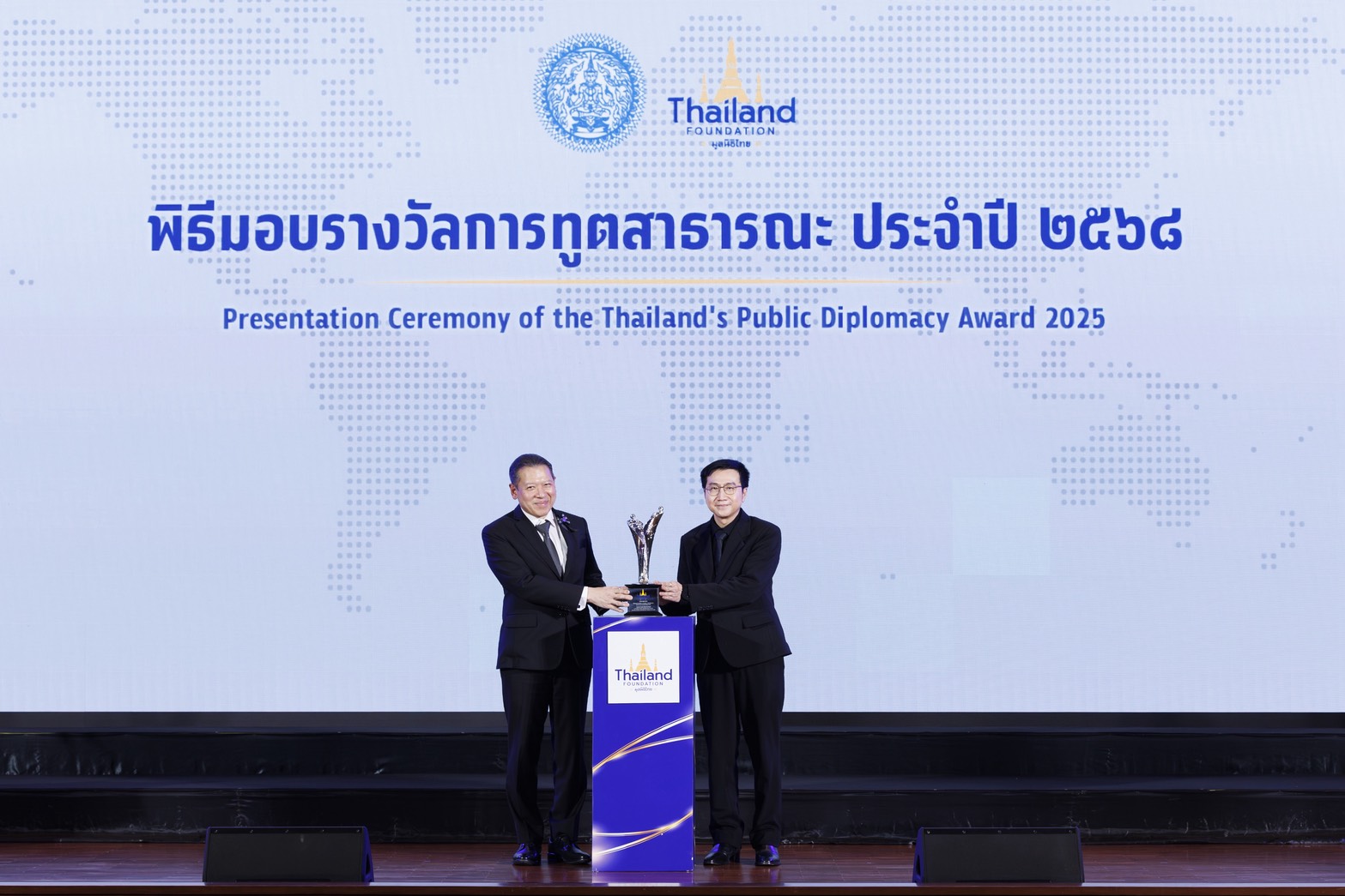 และเข้าสู่ช่วงพิธีการ “คุณธฤต จรุงวัฒน์” เลขาธิการมูลนิธิไทย รายการถึงวัตถุประสงค์ของการมอบรางวัลการทูตสาธารณะ จากนั้น “คุณศรัณย์ เจริญสุวรรณ” เลขานุการรัฐมนตรีว่าการกระทรวงการต่างประเทศ กล่าวเปิดงาน ตามด้วย “คุณธฤต จรุงวัฒน์” เลขาธิการมูลนิธิไทย ประกาศอย่างเป็นทางการว่า “กระทรวงการต่างประเทศและมูลนิธิไทยมีมติมอบรางวัลการทูตสาธารณะ ประจำปี 2568 ให้แก่ บริษัท จีเอ็มเอ็มทีวี จำกัด ในฐานะผู้สร้างสรรค์ผลงานที่เผยแพร่วัฒนธรรมไทยอย่างกว้างขวางบนเวทีโลก” โดยมี “คุณสถาพร พานิชรักษาพงศ์” ประธานเจ้าหน้าที่บริหาร บริษัท จีเอ็มเอ็มทีวี จำกัด เป็นผู้แทนองค์กรขึ้นรับรางวัลจาก “คุณศรัณย์ เจริญสุวรรณ” เลขานุการรัฐมนตรีว่าการกระทรวงการต่างประเทศ ท่ามกลางคณะทูตานุทูต ผู้แทนองค์การระหว่างประเทศ หน่วยงานรัฐ ภาคเอกชน สื่อมวลชน และแขกผู้มีเกียรติที่ร่วมเป็นสักขีพยานอย่างคับคั่ง