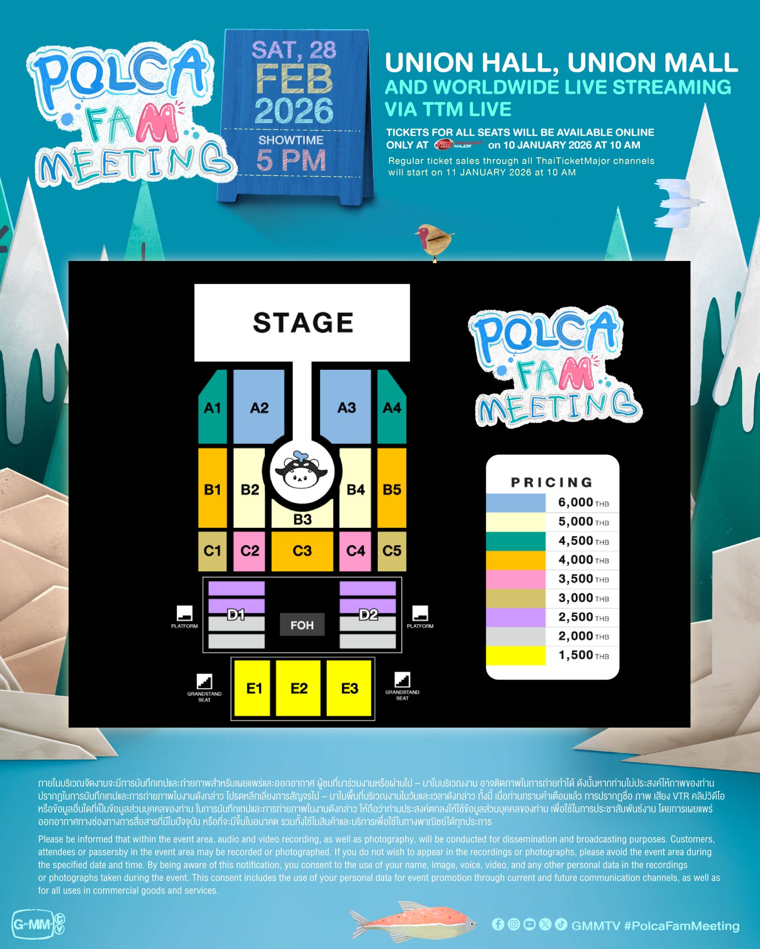 สำหรับผู้สนใจสามารถจับจองบัตรงาน “POLCA FAM MEETING” บนช่องทางออนไลน์ ในวันเสาร์ที่ 10 มกราคม 2569 เริ่มเวลา 10.00 น. เป็นต้นไป เปิดจำหน่ายทุกที่นั่ง ทางออนไลน์ที่ www.thaiticketmajor.com เท่านั้น และ เปิดจำหน่ายบัตร ทุกช่องทางตามปกติ ในวันอาทิตย์ที่ 11 มกราคม 2569 เริ่มเวลา 10.00 น. เป็นต้นไป ทางไทยทิคเก็ตเมเจอร์ทุกสาขา, www.thaiticketmajor.com และ Call center โทร 0-2262-3456 โดยบัตรราคา 6,000 / 5,000 / 4,500 / 4,000 / 3,500 / 3,000 / 2,500 / 2,000 / 1,500 บาท และดูสดผ่าน TTM LIVE บัตรราคา 1,500 / 1,200 บาท (ลิ้งค์และโค้ดรับชม) (กรณีต้องการรับบัตรพลาสติกที่ระลึก ชำระเพิ่ม 30/ใบ) หรือติดตามรายละเอียดเพิ่มเติมได้ที่ www.thaiticketmajor.com หรือ www.facebook.com/gmmtvofficial & Instagram & X & TikTok & YouTube & Weibo : GMMTV