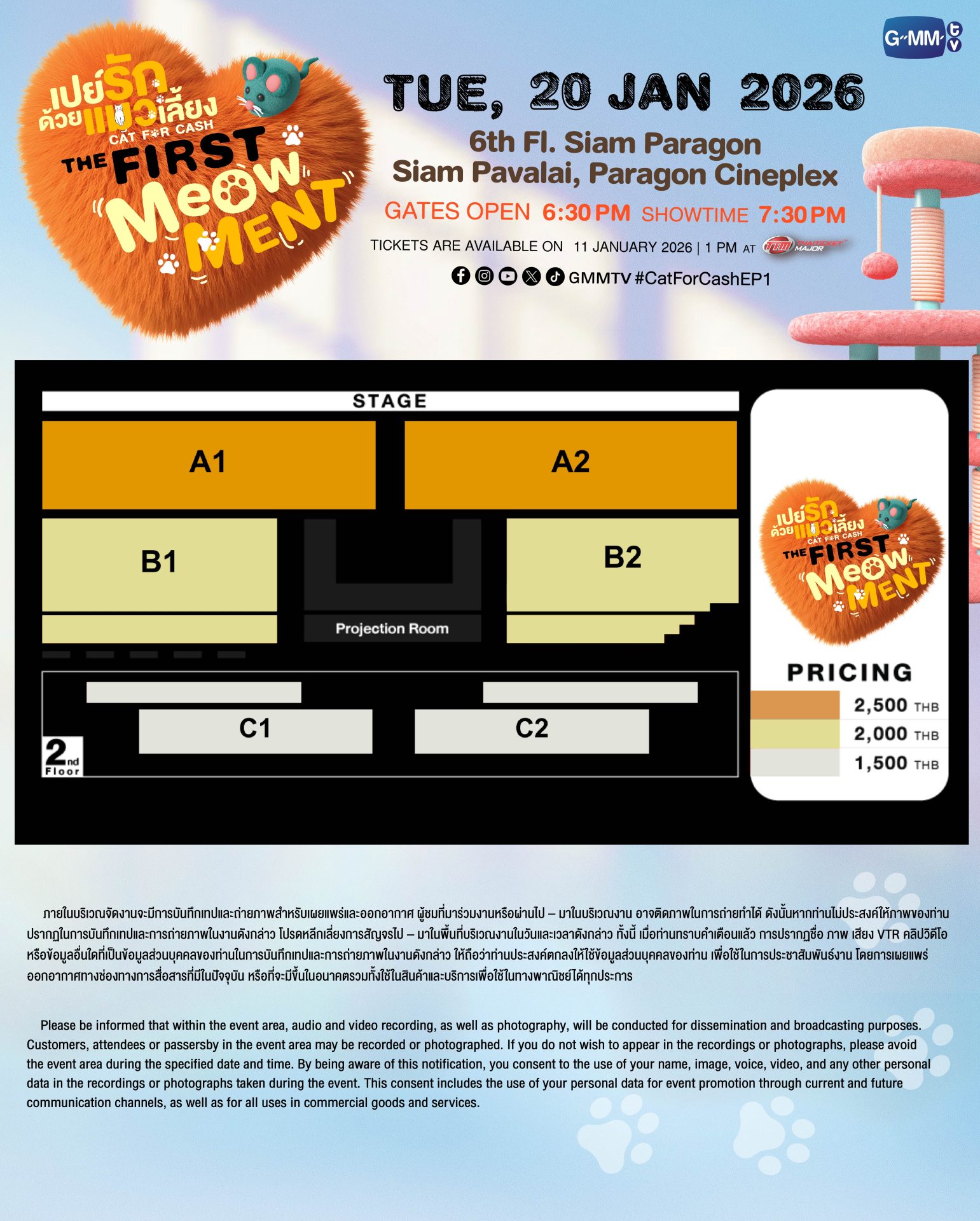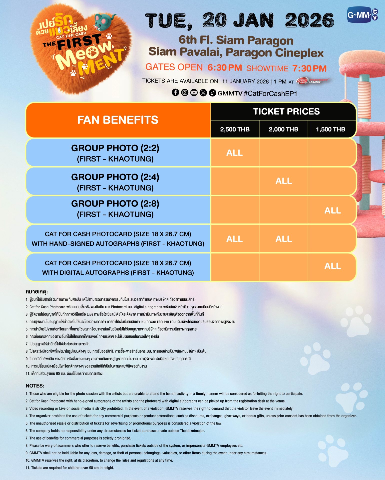 สำหรับผู้ที่สนใจสามารถจองบัตรเข้าร่วมงาน “เปย์รักด้วยแมวเลี้ยง THE FIRST MeOwMENT” เปิดจำหน่ายบัตร วันอาทิตย์ที่ 11 มกราคมนี้ เริ่มเวลา 13.00 น. เป็นต้นไป บัตรราคา 2,500 / 2,000 / 1,500 บาท ที่ ไทยทิคเก็ตเมเจอร์ทุกสาขา, www.thaiticketmajor.com และ Call center โทร 0-2262-3456 หรือติดตามรายละเอียดเพิ่มเติมได้ที่ www.thaiticketmajor.com และ Facebook / Instagram / X / TikTok / YouTube / Weibo: GMMTV