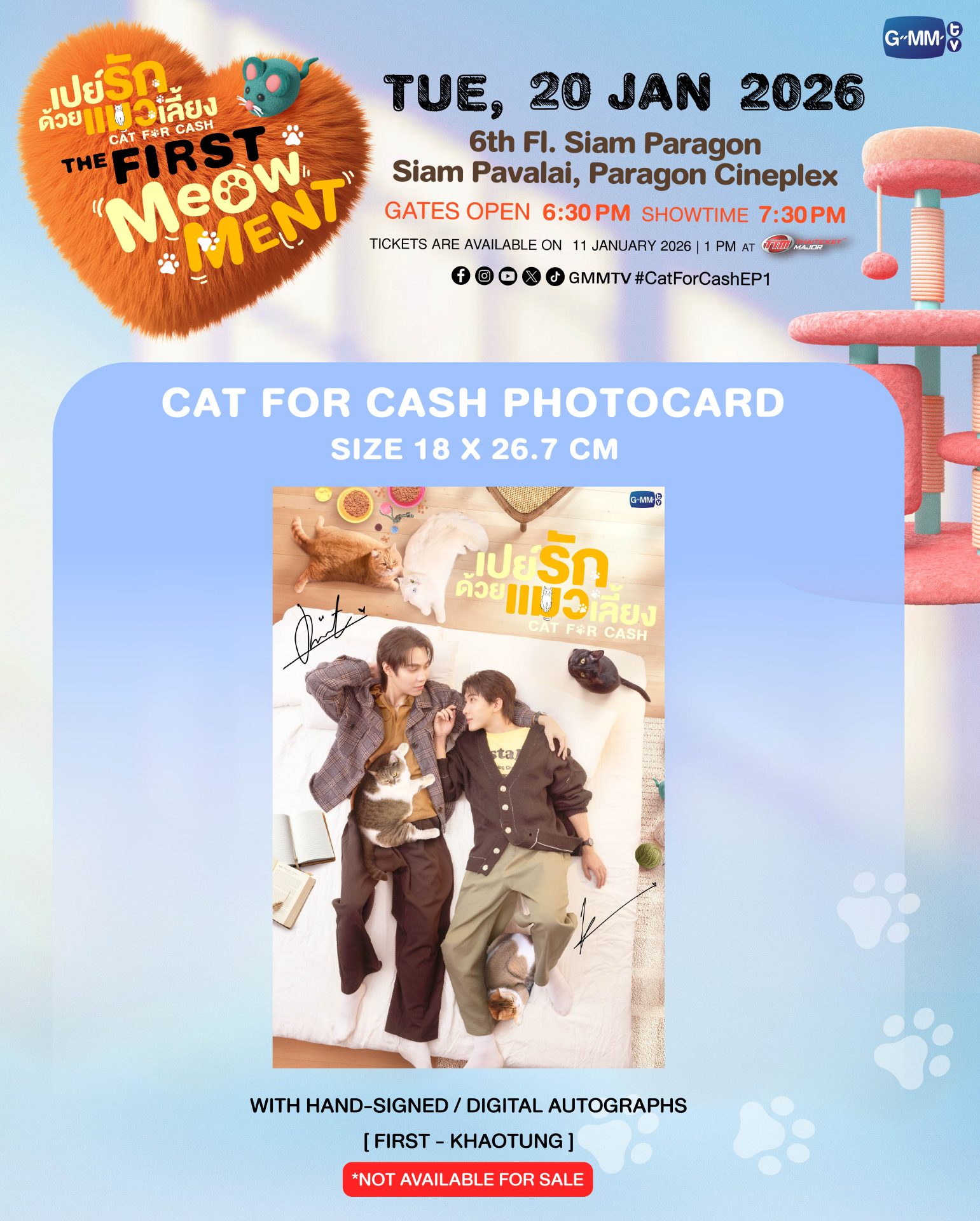 เตรียมตัวอารมณ์ดีประเดิมต้นปีกับซีรีส์สุดน่ารัก “เปย์รักด้วยแมวเลี้ยง” เหนื่อยใจเติมรัก เหนื่อยนัก เติมแมว จาก “GMMTV” คอนเทนต์โพรไวเดอร์ชั้นนำของเมืองไทย ที่พร้อมลงจอให้อบอุ่นหัวใจ กับฝีมือการแสดง ของ 2 คู่ฮอตสุดปัง “เฟิร์ส คณพันธ์ ปุ้ยตระกูล” และ “ข้าวตัง ธนวัฒน์ รัตนกิจไพศาล” ที่จับมือกันเปิดประตู คาเฟ่แมวสุดแปลก อัปเลเวลความเหมียว บอกรักผ่านภาษาแมว ชวนแฟนๆ รับชมตอนแรกพร้อมกัน ในงาน “เปย์รักด้วยแมวเลี้ยง THE FIRST MeOwMENT” พร้อมด้วยผู้กำกับฯ คนเก่ง “กรพรหม นิยมศิลป์” ที่จะ มาร่วมพูดคุยถึงเบื้องหน้าเบื้องหลังการทำงาน และพิเศษสุดๆ กับสเปเชียลโชว์สุดเอ็กซ์คลูซีฟจากเหล่านักแสดงพร้อมโมเมนต์ฟินๆ มามอบให้แฟนๆ แบบเต็มอิ่มสุดๆ ในวันอังคารที่ 20 มกราคม 2569 เวลา 19.30 น. ที่ ชั้น 6 สยามพารากอน – โรงภาพยนตร์สยามภาวลัย Paragon Cineple