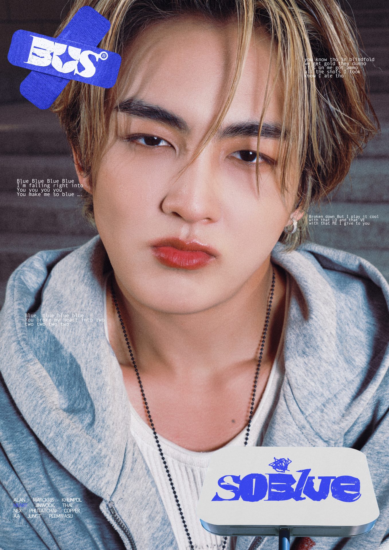 นอกจากนี้ ยังได้ ปู๋ ปิยวัฒน์ มาร่วมแต่งเนื้อร้อง และ BUS ได้มีส่วนร่วมในการปรับและพัฒนาเนื้อร้อง เพื่อถ่ายทอดตัวตนของวงออกมาอย่างชัดเจน โดยมีการใช้คำว่า Blue เป็นแกนหลัก ซึ่งมีความหมายได้ทั้ง ความเศร้า ตามเนื้อหาเพลง และ สีฟ้า ที่สะท้อนความสดใสตามดนตรีของเพลงนี้ โดยในท่อนฮุคมีการนำคำว่า Blue มาใช้ซ้ำ ๆ แต่เปลี่ยนทำนองไปเรื่อย ๆ เพื่อให้ติดหู ร้องตามง่าย และจดจำได้ตั้งแต่ฟังครั้งแรก ส่วนในพาร์ตของท่อนแรป ได้ ALAN, JINWOOK และ JUNGT มาร่วมแต่งและเรียบเรียงด้วยตัวเอง เติมเอกลักษณ์เฉพาะตัวให้กับเพลงนี้