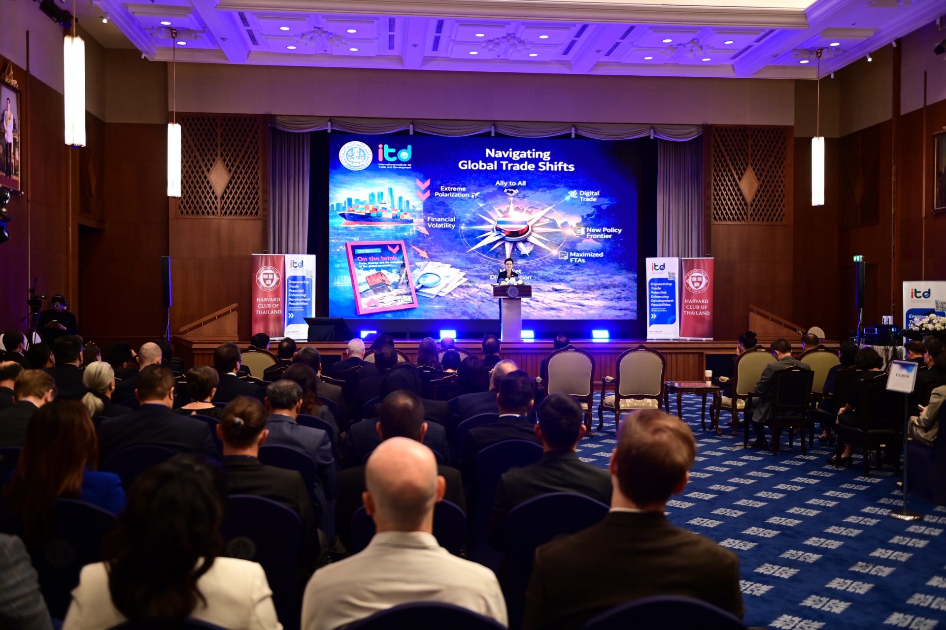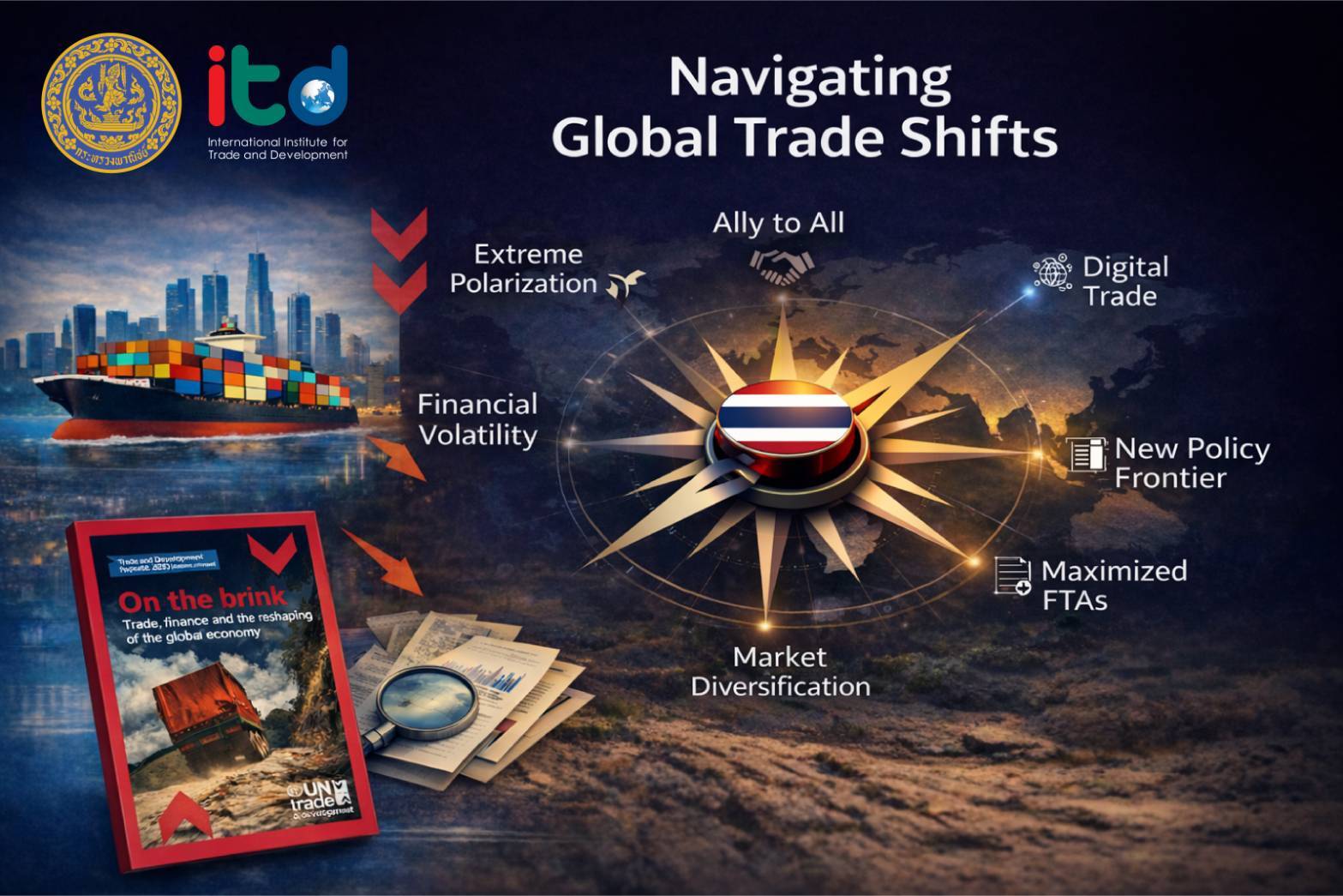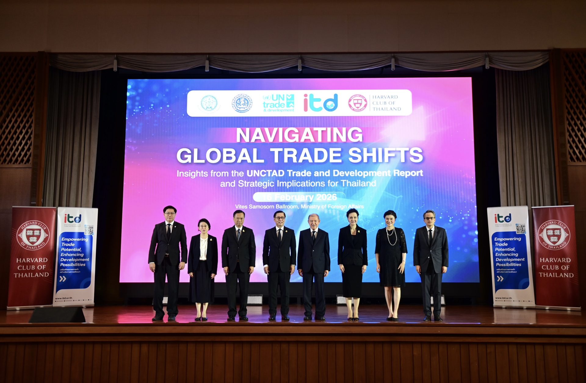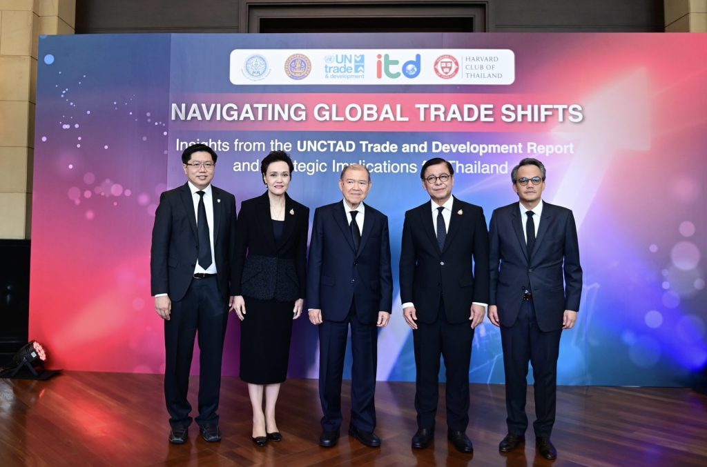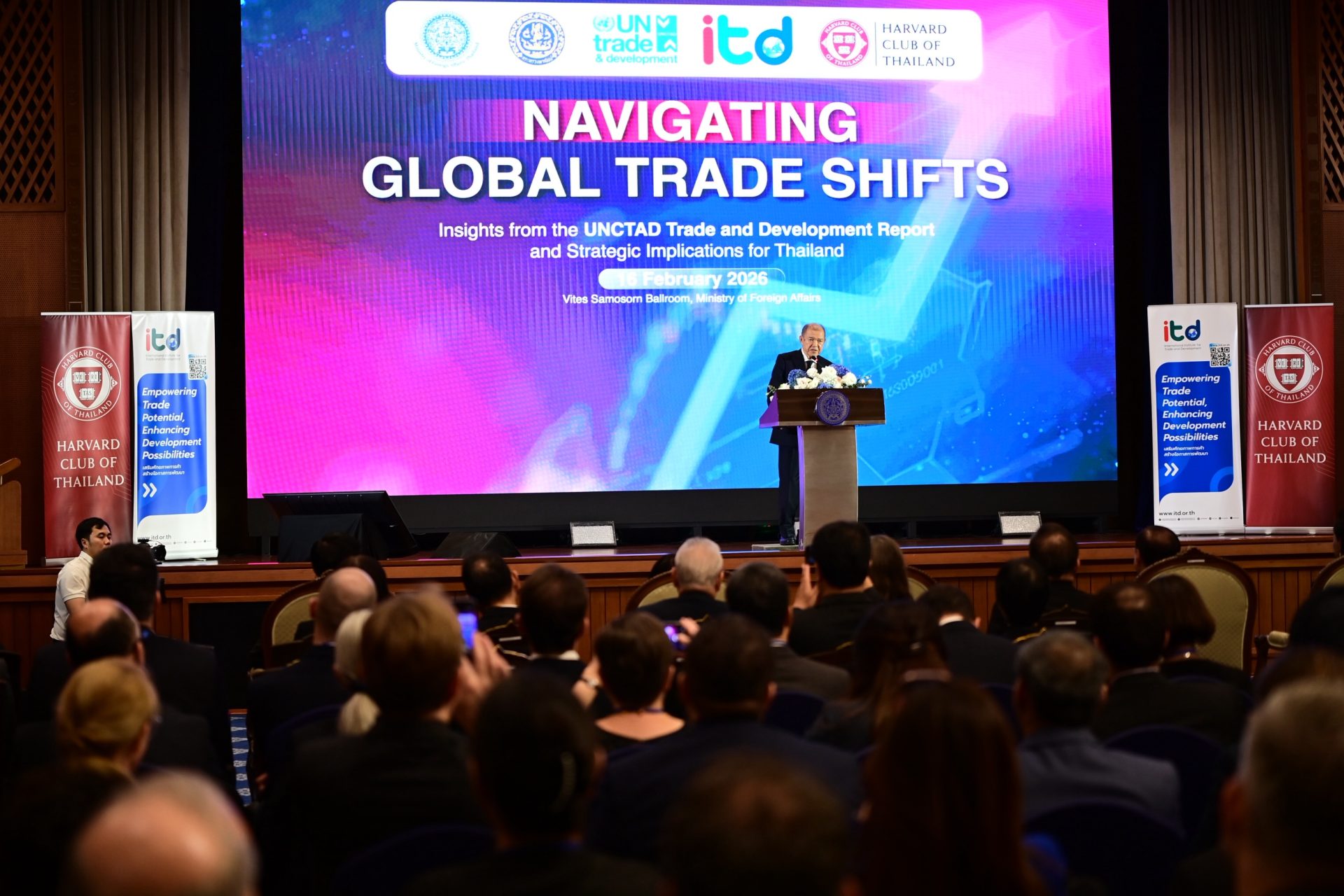 เมื่อวันที่ 16 กุมภาพันธ์ 2569 สถาบันระหว่างประเทศเพื่อการค้าและการพัฒนา (องค์การมหาชน) ITD ร่วมกับกระทรวงพาณิชย์ กระทรวงการต่างประเทศ UN Trade and Development (UNCTAD) และสมาคมนักเรียนเก่าฮาร์วาร์ดแห่งประเทศไทย จัดเวทีสัมมนาวิชาการนานาชาติหัวข้อ “Navigating Global Trade Shifts: Insights from the UNCTAD Trade and Development Report and Strategic Implications for Thailand” ณ ห้องวิเทศสโมสร กระทรวงการต่างประเทศ และผ่านระบบ Hybrid โดยมีผู้เข้าร่วมกว่า 150 คน จากภาครัฐ ภาคเอกชน สถาบันการศึกษา และองค์กรระหว่างประเทศ เพื่อร่วมกันวิเคราะห์ทิศทางเศรษฐกิจโลกจากรายงาน Trade and Development Report 2025 (TDR 2025) และกำหนดยุทธศาสตร์การค้าของไทยให้สอดรับกับบริบทโลกที่กำลังเปลี่ยนผ่านอย่างมีนัยสำคัญ