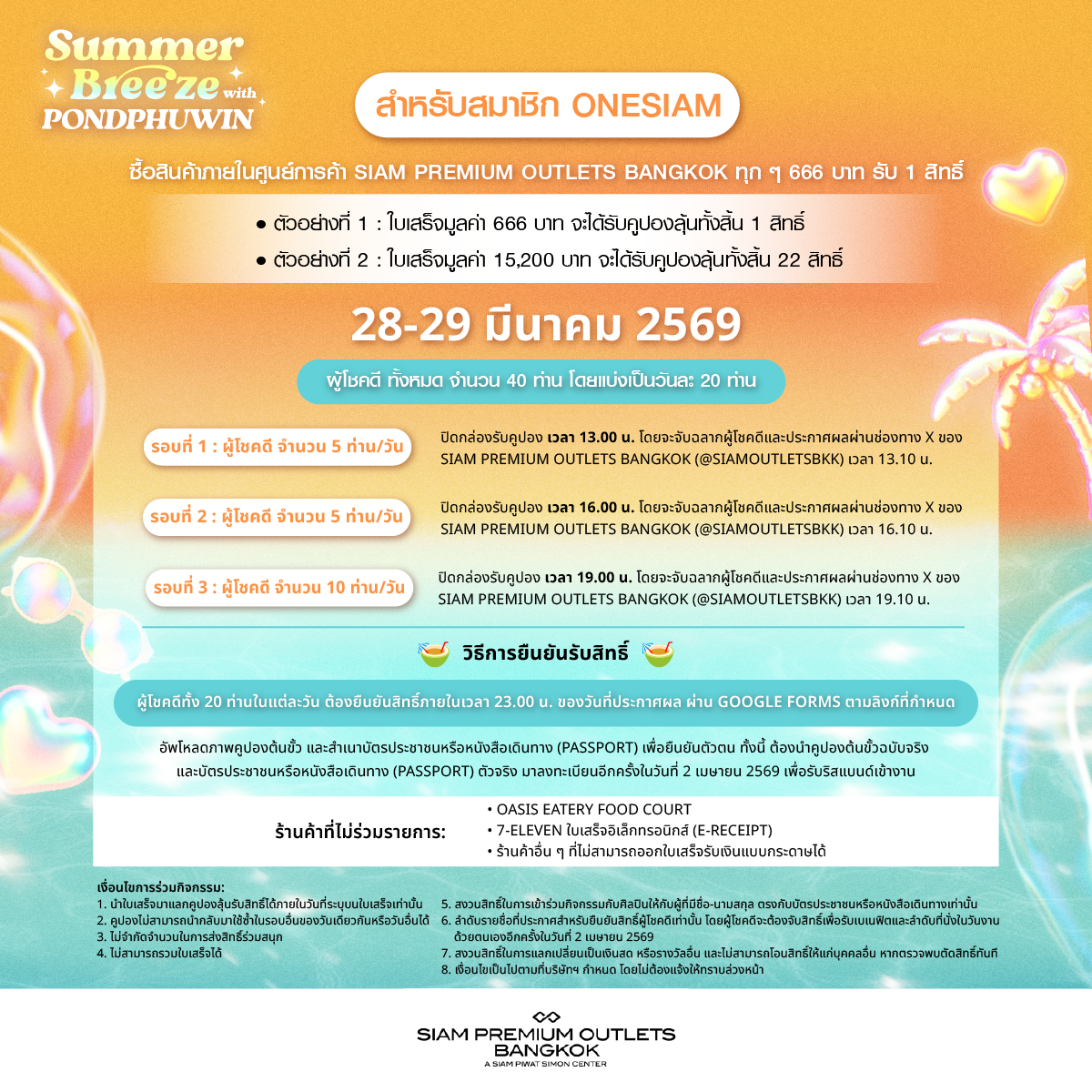 สมาชิก ONESIAM ร่วมลุ้นเป็น 1 ใน 50 LUCKY FANS เข้าร่วมกิจกรรมสุดพิเศษพร้อมรับของขวัญเอ็กซ์คลูซีฟจากสองหนุ่ม “ปอนด์ – ภูวินทร์” เพียงช้อปภายในศูนย์การค้า SIAM PREMIUM OUTLETS BANGKOK ทุก 666 บาท ต่อใบเสร็จ รับ 1 สิทธิ์ โดยลงทะเบียนเข้าร่วมแคมเปญ SUMMER BREEZE X PONDPHUWIN ผ่าน ONESIAM SuperApp เฉพาะวันที่ 28 – 29 มีนาคม 2569 และ 2 เมษายน 2569 เพียง 3 วันเท่านั้น! ยิ่งช้อปมาก ยิ่งเพิ่มโอกาสที่จะได้ใกล้ชิดศิลปินที่คุณชื่นชอบมากขึ้น