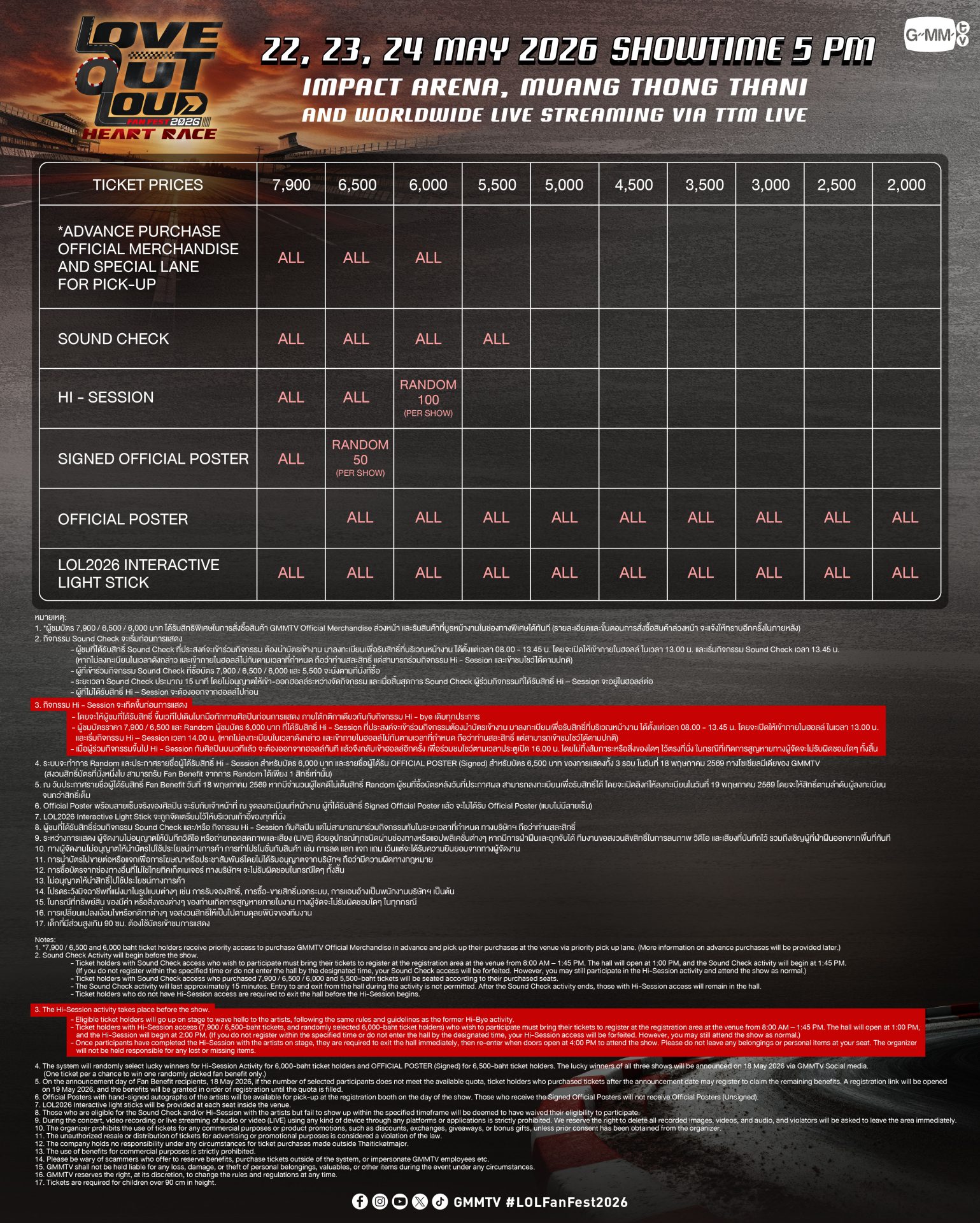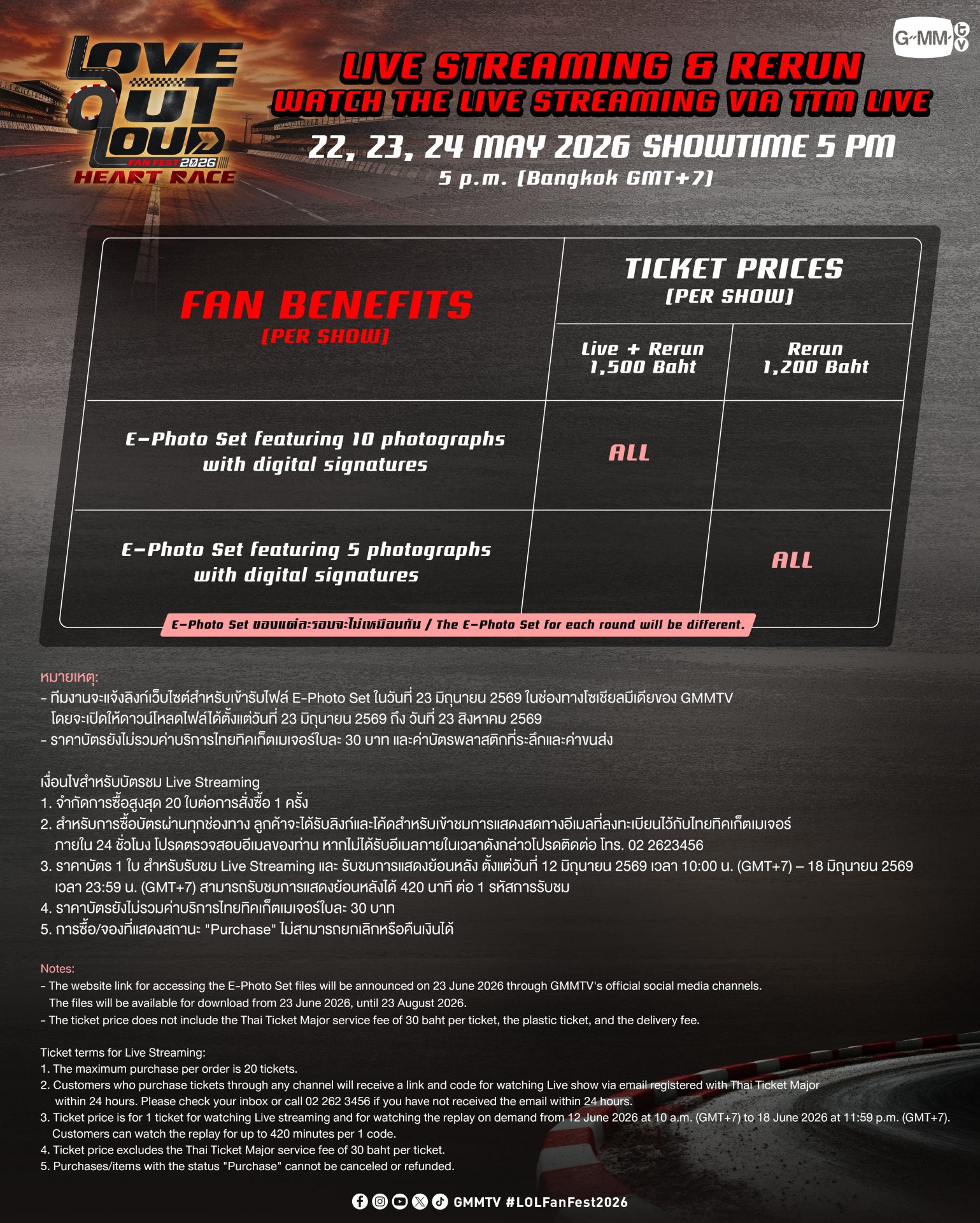 สำหรับผู้ที่สนใจสามารถบัตรงาน “LOVE OUT LOUD FAN FEST 2026 : HEART RACE” ทาง ONLINE ในวันเสาร์ที่ 21 มีนาคมนี้ เวลา 10.00 น. ทาง www.thaiticketmajor.com เท่านั้น และเปิดขายบัตรทุกช่องทาง ในวันอาทิตย์ที่ 22 มีนาคม 2569 เวลา 10.00 น. บัตรราคา 7,900 / 6,500 / 6,000 / 5,500 / 5,000 / 4,500 / 3,500 / 3,000 / 2,500 และ 2,000 บาท และดูสดผ่าน TTM LIVE บัตรราคา 1,500 / 1,200 บาท (ลิ้งค์และโค้ดรับชม) (กรณีต้องการรับบัตรพลาสติกที่ระลึก ชำระเพิ่ม 30/ใบ) และติดตามรายละเอียดเพิ่มเติมได้ที่ www.thaiticketmajor.com หรือ www.facebook.com/gmmtvofficial & Instagram & X & TikTok & YouTube & Weibo : GMMTV