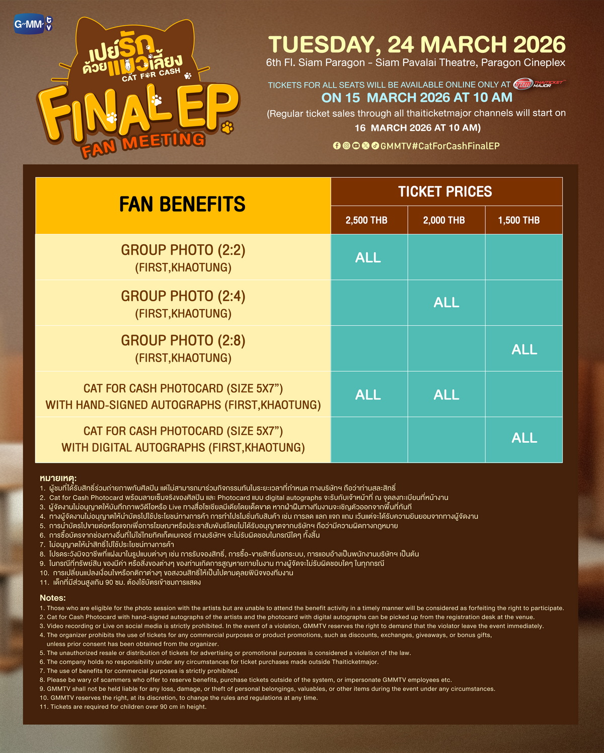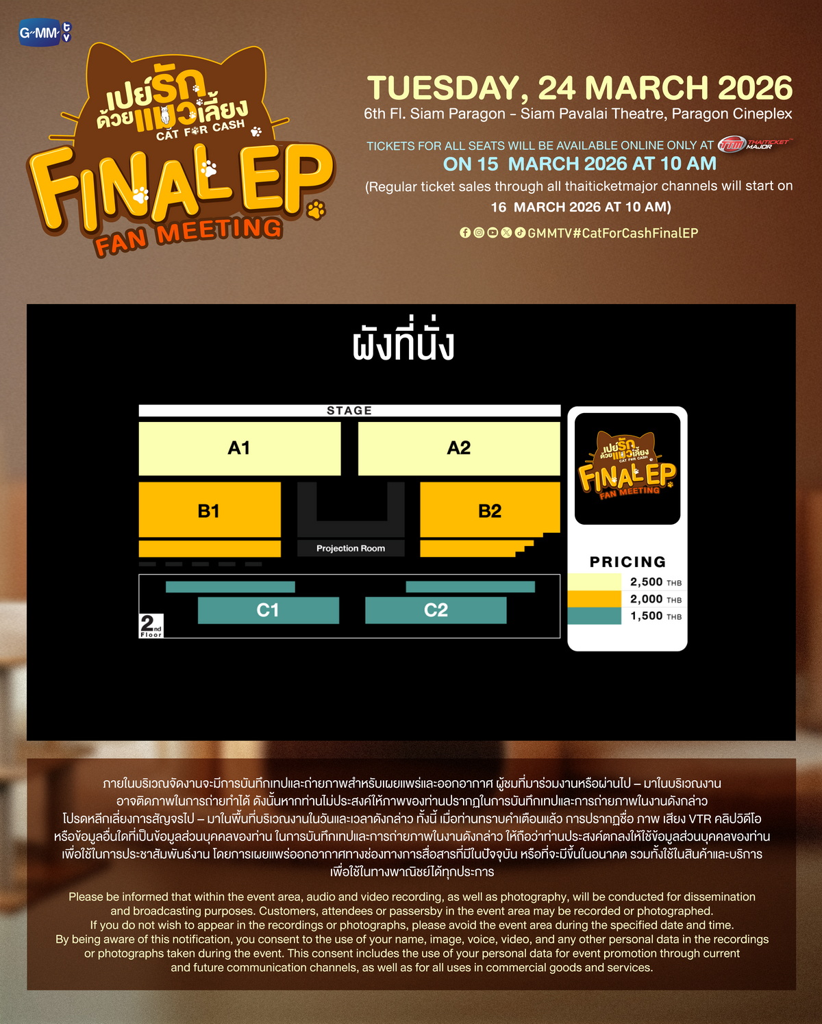 สำหรับผู้ที่สนใจสามารถจองบัตรเข้าร่วมงาน “เปย์รักด้วยแมวเลี้ยง Final EP. FAN MEETING” เปิดจำหน่ายบัตร บนช่องทาง Online : วันอาทิตย์ที่ 15 มีนาคมนี้ เริ่มเวลา 10:00 น. เป็นต้นไป เปิดจำหน่ายทุกที่นั่ง ทางออนไลน์ที่ www.thaiticketmajor.com เท่านั้น และเปิดจำหน่ายบัตร ทุกช่องทางตามปกติ : วันจันทร์ที่ 16 มีนาคม 2569 เริ่มเวลา 10:00 น. เป็นต้นไป บัตรราคา 2,500, 2,000, 1,500 บาท ทางไทยทิคเก็ตเมเจอร์ทุกสาขา, www.thaiticketmajor.com และ Call center โทร 0-2262-3456 หรือติดตามรายละเอียดเพิ่มเติมได้ที่ www.thaiticketmajor.com และ Facebook / Insta-gram / X / TikTok / YouTube / Weibo: GMMTV