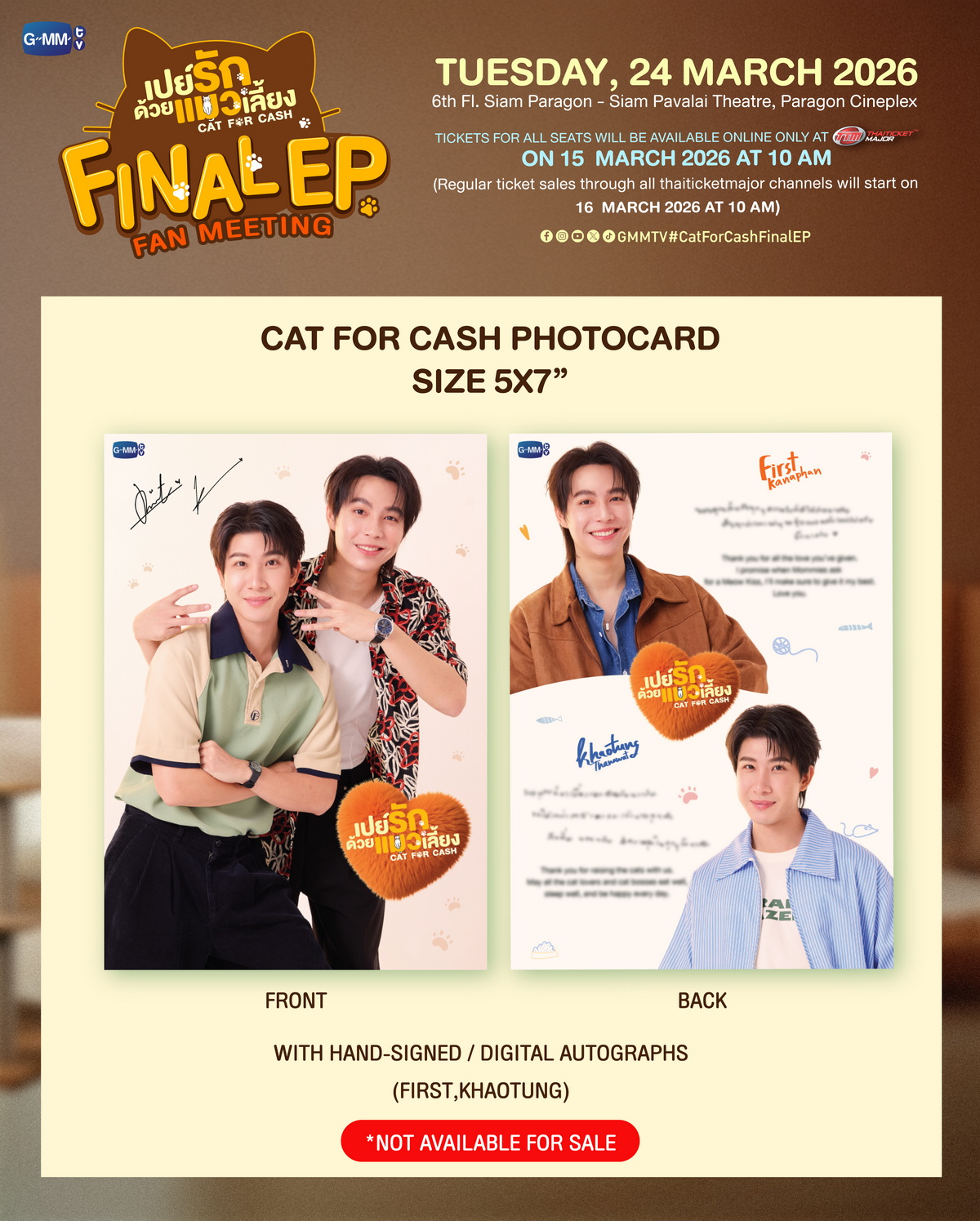 อบอุ่นอารมณ์ดีดูแล้วมีความสุขสนุกตลอดทั้งเรื่อง สำหรับซีรีส์ฟีลกู๊ดฮีลใจ “เปย์รักด้วยแมวเลี้ยง” เหนื่อยใจเติมรัก เหนื่อยนัก เติมแมว จาก “GMMTV” คอนเทนต์โพรไวเดอร์ชั้นนำของเมืองไทย กับฝีมือการแสดง ของ 2 คู่ฮอตเคมีปัง “เฟิร์ส คณพันธ์ ปุ้ยตระกูล” และ “ข้าวตัง ธนวัฒน์ รัตนกิจไพศาล” กอดคอเพื่อนๆ แก๊งเหมียว “สตางค์ กิตติภพ เสรีวิชยสวัสดิ์, เกรท สพล อัศวมั่นคง, เจเจ ชยกร จุฑามาศ” ชวนแฟนๆ ร่วมลุ้นและรับชมตอนสุดท้ายพร้อมกัน ในงาน “เปย์รักด้วยแมวเลี้ยง Final EP. FAN MEET-INGT” พร้อมด้วย ผู้กำกับฯ คนเก่ง “กรพรหม นิยมศิลป์” มาร่วมพูดคุยถึงเบื้องหน้าเบื้องหลังการทำงาน และพิเศษสุดๆ กับสเปเชียลโชว์สุดเอ็กซ์คลูซีฟจากเหล่านักแสดงที่เตรียมเสิร์ฟโมเมนต์บอกรักผ่านภาษาแมวให้ฟูลฟิลตลอดทั้ง งาน ในวันอังคารที่ 24 มีนาคม 2569 เวลา 19.30 น. ที่ ชั้น 6 สยามพารากอน โรงภาพยนตร์ สยามภาวลัย Paragon Cineplex