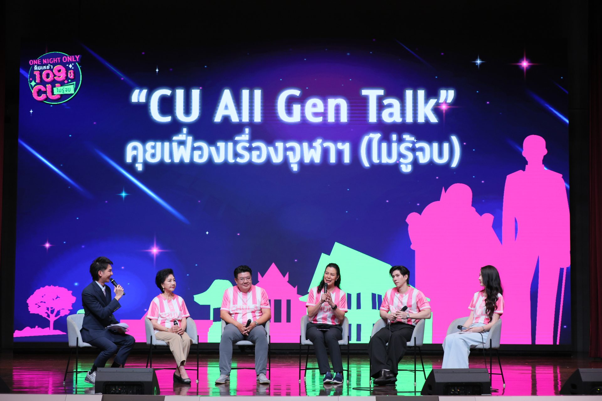 ในงานแถลงข่าว “One Night Only คืนเหย้า 109 ปี CU ไม่รู้จบ” เมื่อวันจันทร์ที่ 16 มีนาคม 2569 ณ หอประชุมคณะวิศวกรรมศาสตร์ จุฬาลงกรณ์มหาวิทยาลัย มีช่วงหนึ่งที่พิเศษกว่าการแถลงข่าวทั่วไป นั่นคือช่วง CU All Gen Talk ที่สมาคมนิสิตเก่าจุฬาฯ ได้เชิญตัวแทนชาวจุฬาฯ 5 คน จาก 5 วัย ตั้งแต่รุ่น CU2505 ไปจนถึง CU2568 มานั่งคุยกันบนเวทีเดียว