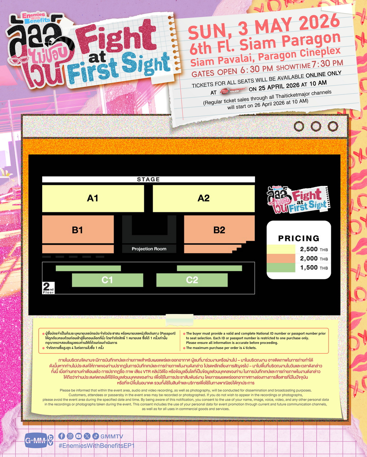 สำหรับผู้ที่สนใจสามารถจองบัตรเข้าร่วมงาน “ลัลล์ไม่ชอบไวน์ Fight at First Sight” เปิดจำหน่ายบัตร บนช่องทางออนไลน์ ในวันเสาร์ที่ 25 เมษายน 2569 เริ่มเวลา 10.00 น. เป็นต้นไป เปิดจำหน่ายทุกที่นั่งทางออนไลน์ ทาง www.thaiticketmajor.com เท่านั้น และเปิดจำหน่ายบัตร ทุกช่องทางตามปกติ ในวันอาทิตย์ที่ 26 เมษายน 2569 เวลา 10.00 เป็นต้นไป ทาง ไทยทิคเก็ตเมเจอร์ทุกสาขา, www.thaiticketmajor.com และ Call center โทร 0-2262-3456 บัตรราคา 2,500 / 2,000 / 1,500 บาท หรือติดตามรายละเอียดเพิ่มเติมได้ที่ www.thaiticketmajor.com และ Facebook / Instagram / X / TikTok / YouTube / Weibo: GMMTV